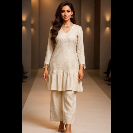 Handwork Co-ord Set Green Top With Off-White Pant 46