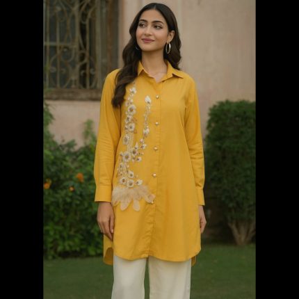 Handwork Co-ord Set Yellow Top With Off – White Pant 42