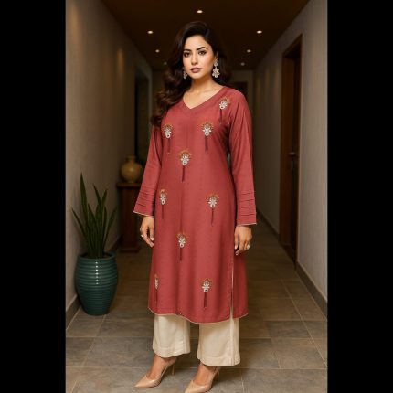 Handwork Co-ord Set Rusty Red Top With Off _ White pant 40