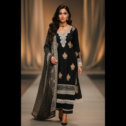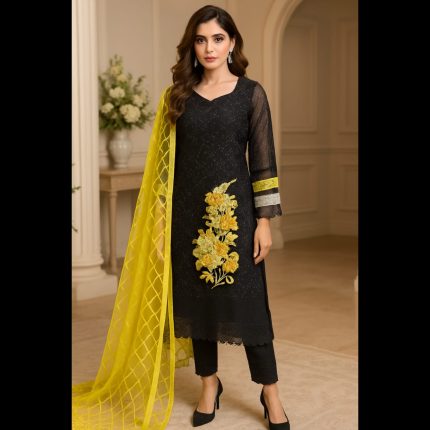 Black Top With Intricate Pink Embroidery With Pant And Dupatta 44