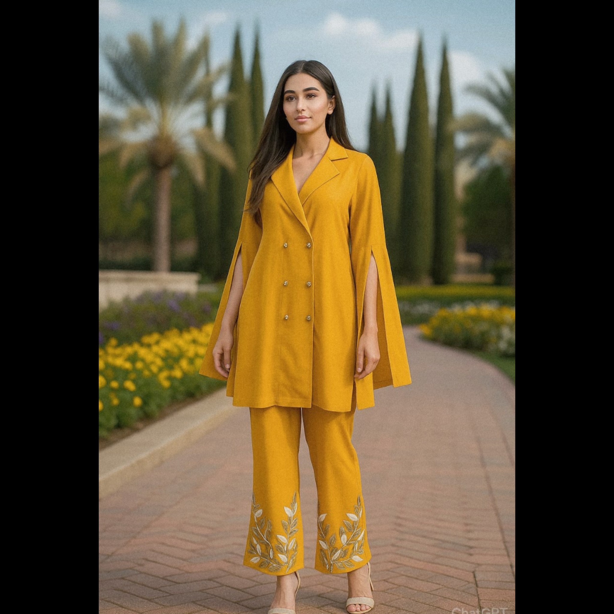 Crafted from premium-quality fabric, this co-ord set ensures both comfort and style, making it ideal for festive events, casual gatherings, or even stylish daytime outings. The seamless coordination of the top and the detailed pants creates a chic, polished look that flatters any silhouette. Designed for the modern woman who appreciates bold fashion with a touch of artistry, this Bright Yellow Co-ord Set is sure to elevate your wardrobe and leave a lasting impression wherever you go.