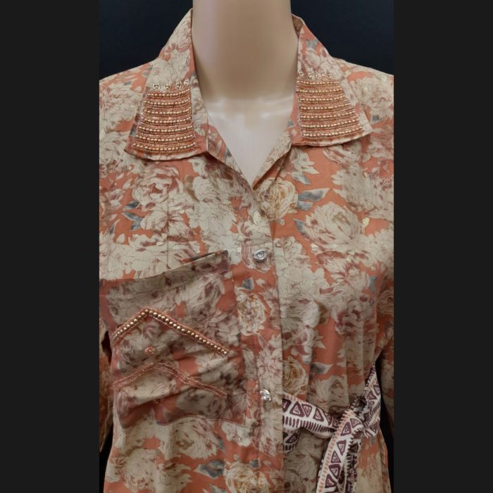 The shirt showcases a simple yet stylish collar with buttons running down the center to the hemline, creating a streamlined look that exudes confidence. A half belt at the waist accentuates your silhouette, ensuring a flattering fit while adding a contemporary edge. The collar and front pocket are embellished with fine handwork, showcasing artisanal craftsmanship and adding a touch of unique charm to the design.