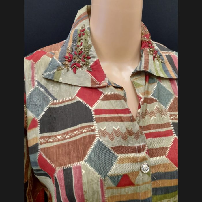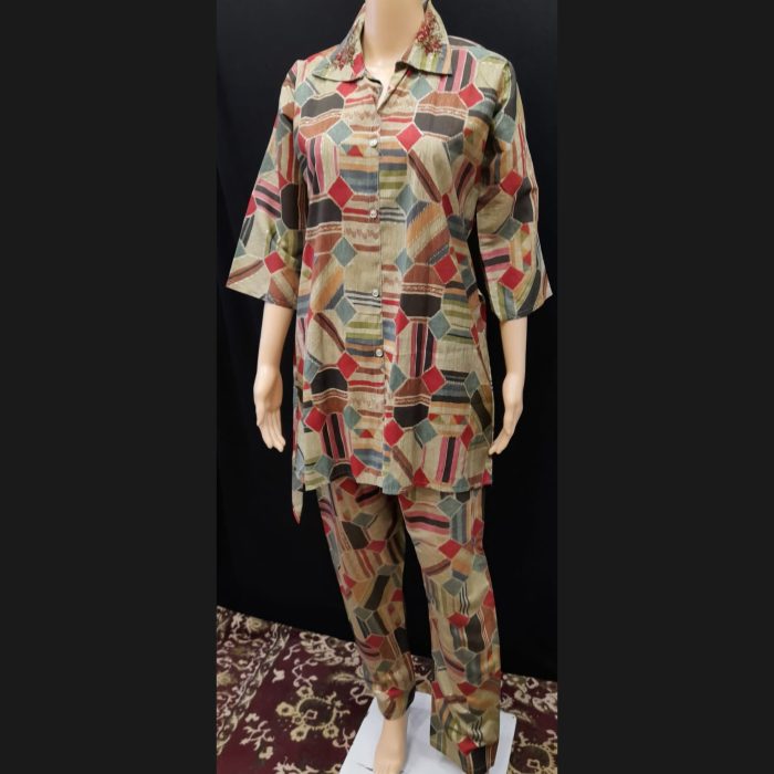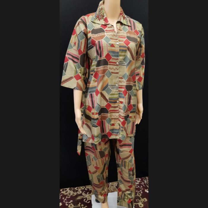 The shirt is detailed with a classic collar adorned with intricate handwork, bringing a touch of artisanal craftsmanship that beautifully enhances the design. Fancy buttons run gracefully down the center to the hemline, adding an elegant flair. Paired with straight-cut pants, this co-ord set not only ensures comfort but also delivers a streamlined, sophisticated silhouette.