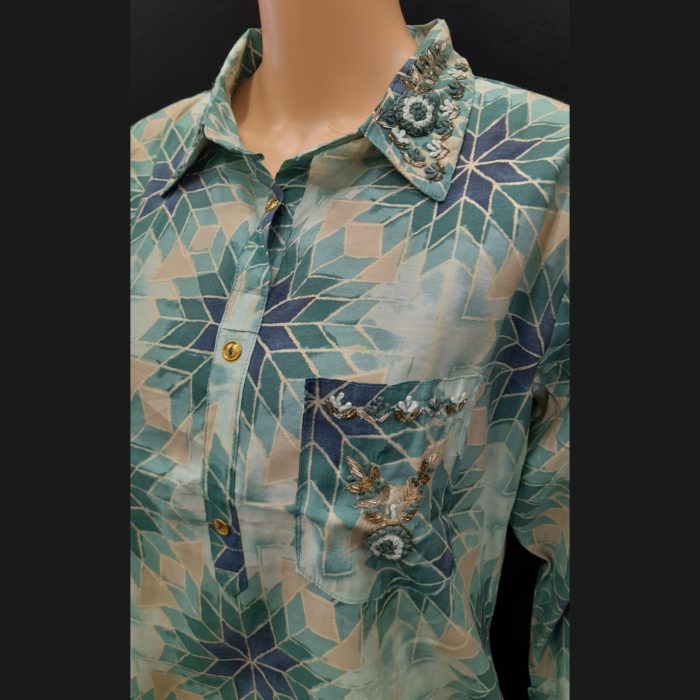 The shirt is elegantly designed with a classic shirt collar and boasts fancy buttons that run down the front, adding a sophisticated touch. Each sleeve is adorned with buttons and loops at the cuffs, providing a tailored look that enhances the overall design. The intricate handwork on the collar and front pocket showcases artisanal skill, elevating the outfit with unique detailing that sets it apart.