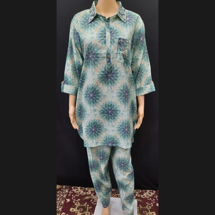 Introducing our Aquamarine Blue Geometric Design Co-ord Set—a stunning blend of contemporary style and premium craftsmanship. This high-quality ensemble features a captivating geometric pattern in vibrant aquamarine blue, making it an eye-catching choice for any fashion-forward individual.