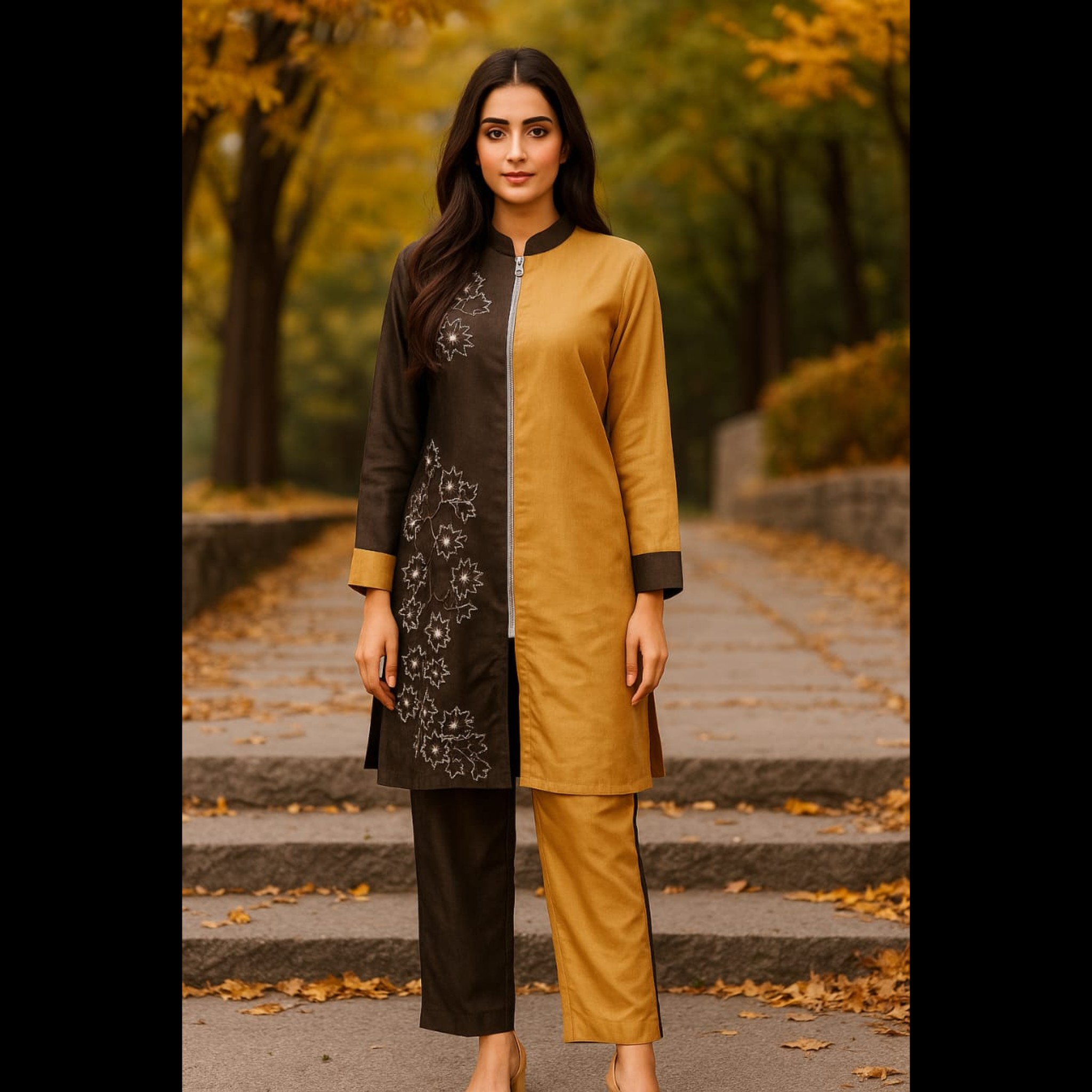 Discover the Shining Ochre and Dark Brown Co-ord Set, a blend of contemporary chic and artisanal craftsmanship. The warm ochre and brown top is adorned with exquisite handwork embroidery, meticulously crafted to create a rich texture and intricate detailing. Paired with sleek combo bottoms, this outfit strikes the perfect balance between bold color and subtle sophistication. The addition of a practical yet stylish zipper enhances the modern aesthetic, making this set as functional as it is fashionable. Whether for casual events or semi-formal gatherings, this co-ord set promises a polished and effortlessly stylish look, perfect for making a lasting impression.