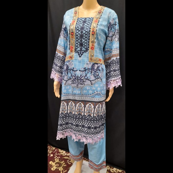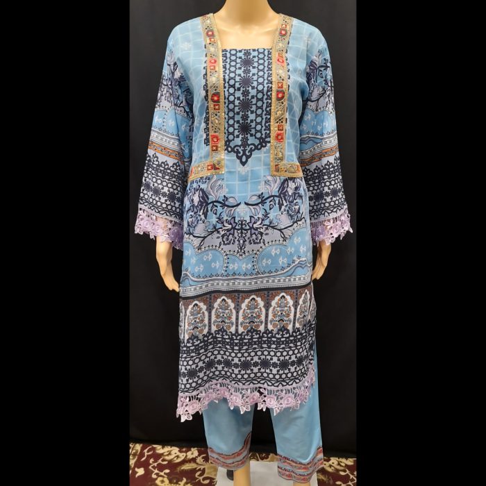 Be the first to review “Aqua Blue Cotton Printed Lacework Suit 42”