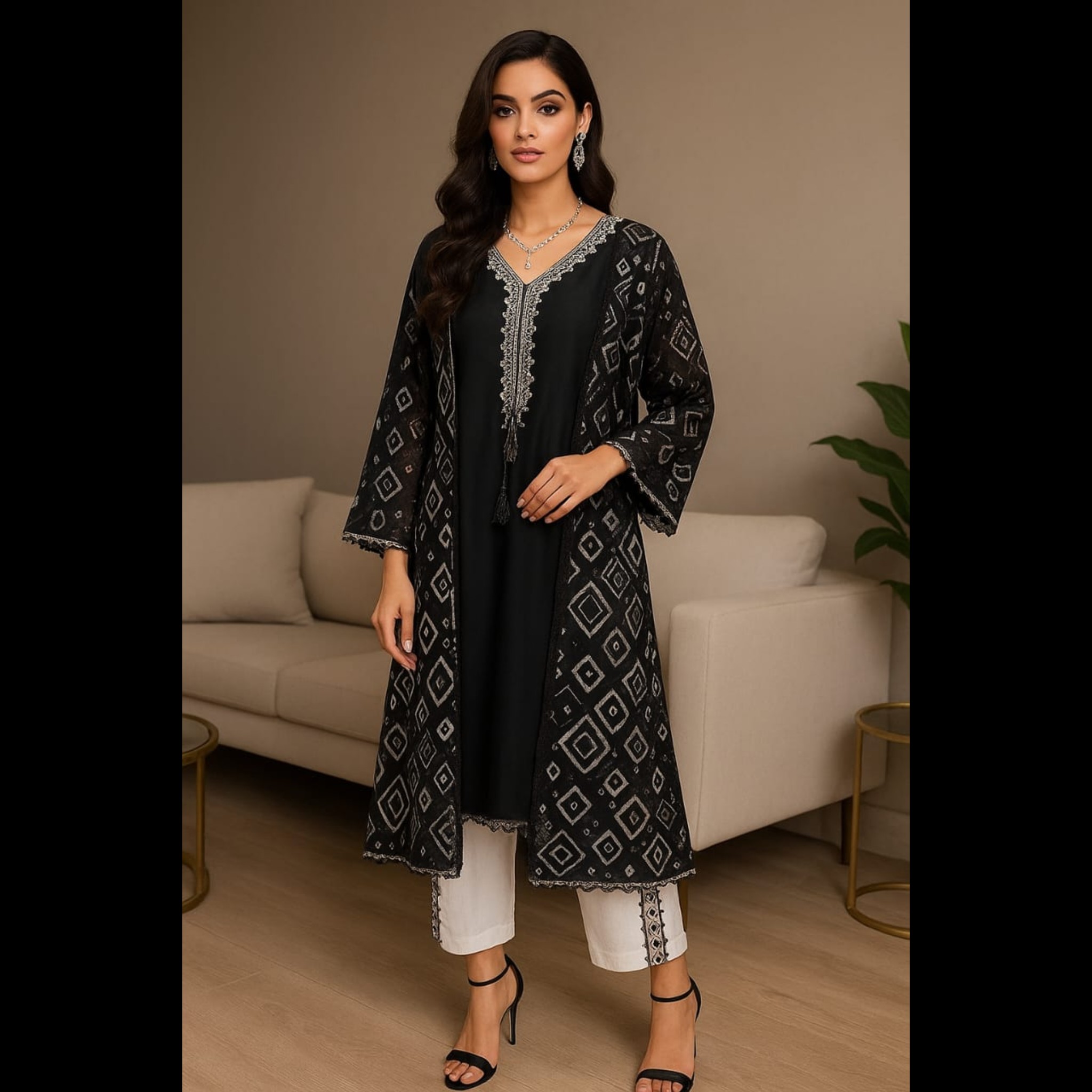 Beneath the jacket, the outfit includes a beautifully designed top with handwork embroidery lace that adds a touch of intricate detailing. The hand-embroidered lace showcases fine craftsmanship, incorporating delicate patterns that elevate the outfit with subtle artistry. The embroidery provides a harmonious contrast to the bold monochrome theme, adding depth and elegance to the ensemble.