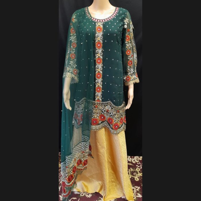 Step into the spotlight with our Dark Green and Gold Heavy Embroidered Georgette Suit, a masterpiece of luxury and elegance. This suit brings together the rich tones of dark green with intricate gold embroidery, while adding touches of red, orange, and beige to create an ensemble that is both eye-catching and sophisticated. Crafted from high-quality georgette, this suit is designed for comfort and effortless grace, making it an ideal choice for grand occasions, weddings, and celebrations.