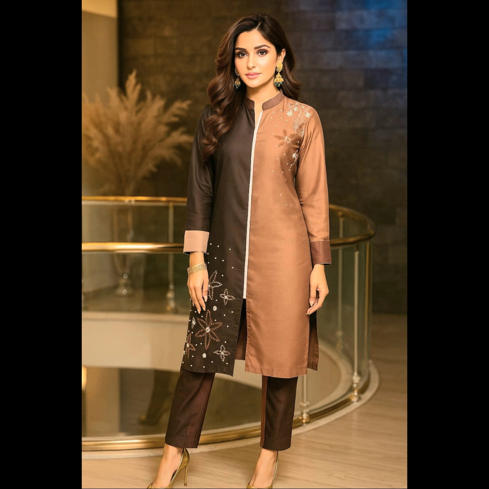 This beautifully designed co-ord set combines rich tones of brown and black, adorned with stunning star-themed embroidery. The set includes a long kurta with a modern collar and matching straight pants. Crafted from premium imported fabric, this ensemble is perfect for both casual and semi-formal occasions.