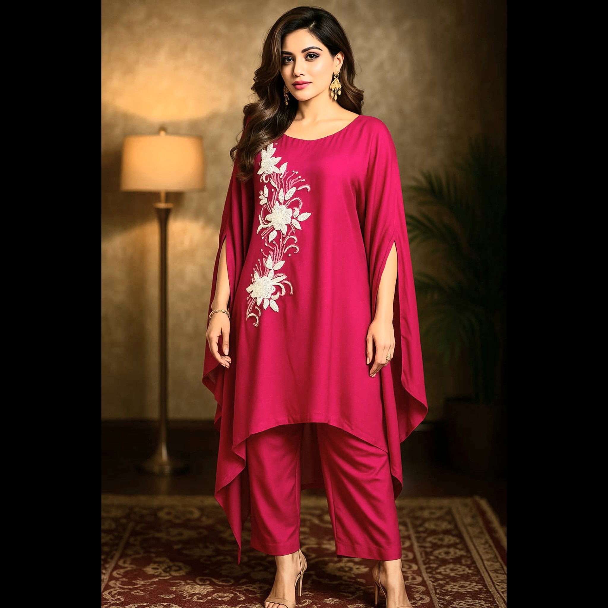 Vibrant fuchsia kaftan adorned with delicate white floral embroidery, combining boldness and elegance in one design.
