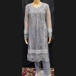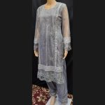 Step into elegance with our stunning Gray and Silver Suit, designed to make you shine with its luxurious detailing and refined charm. The top is crafted from premium fabric in a sophisticated gray shade, adorned with self-colored sequins for a subtle shimmer that catches the light beautifully. Silver mirror work and broad lace along with cutwork accents add a touch of glamour to the outfit, creating a mesmerizing effect perfect for any special occasion.