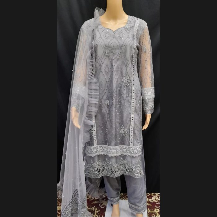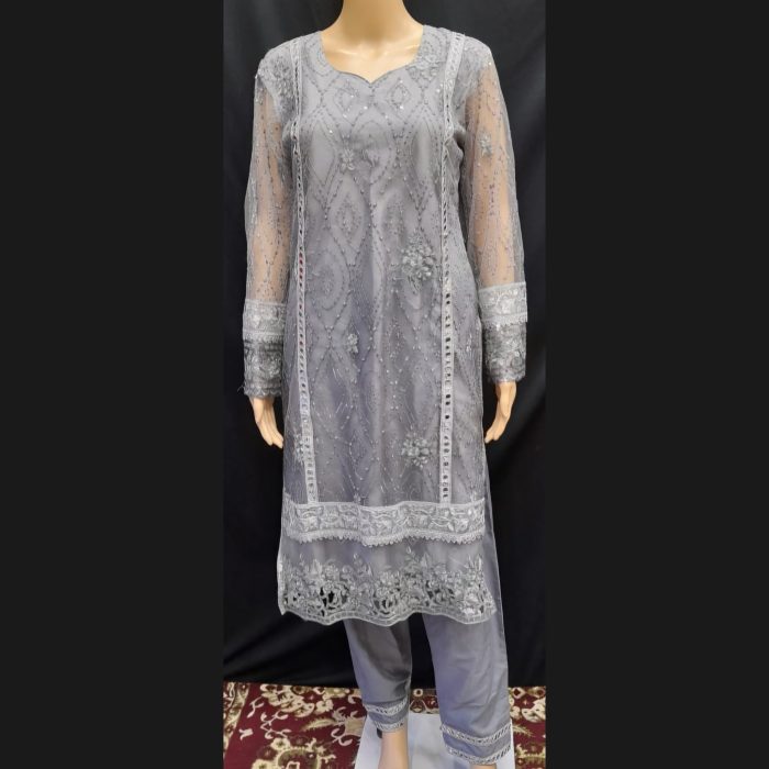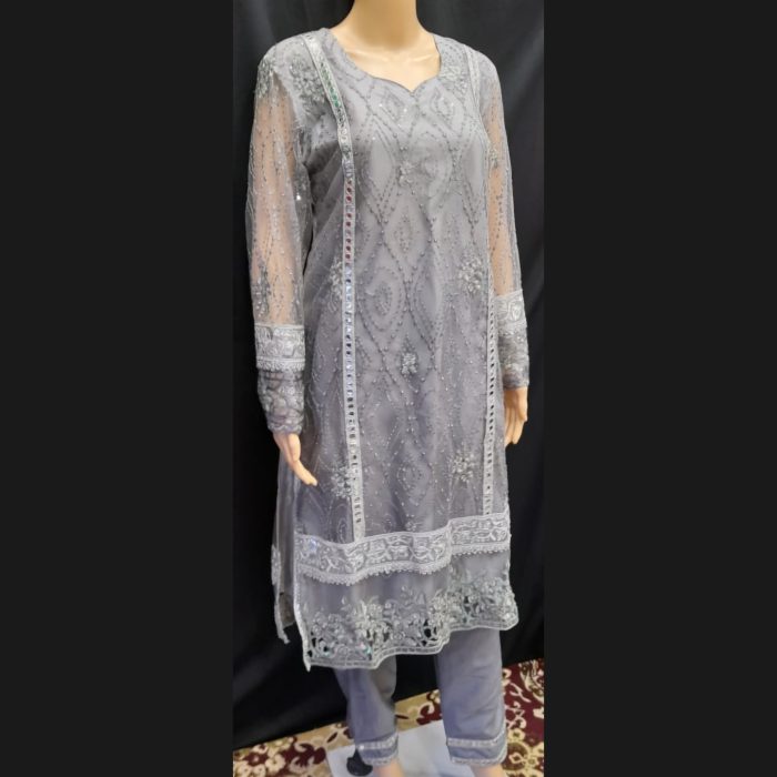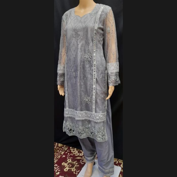 Step into elegance with our stunning Gray and Silver Suit, designed to make you shine with its luxurious detailing and refined charm. The top is crafted from premium fabric in a sophisticated gray shade, adorned with self-colored sequins for a subtle shimmer that catches the light beautifully. Silver mirror work and broad lace along with cutwork accents add a touch of glamour to the outfit, creating a mesmerizing effect perfect for any special occasion.