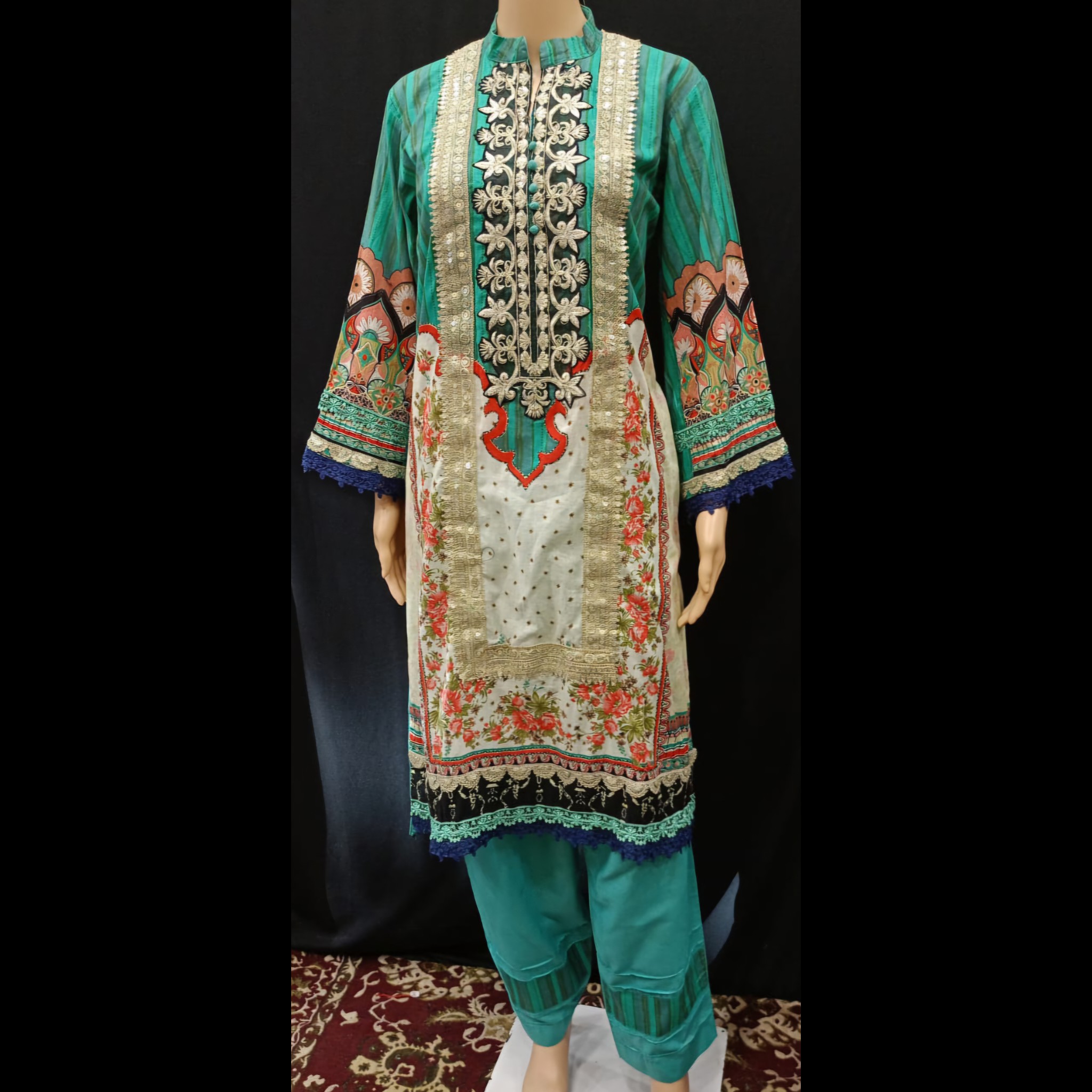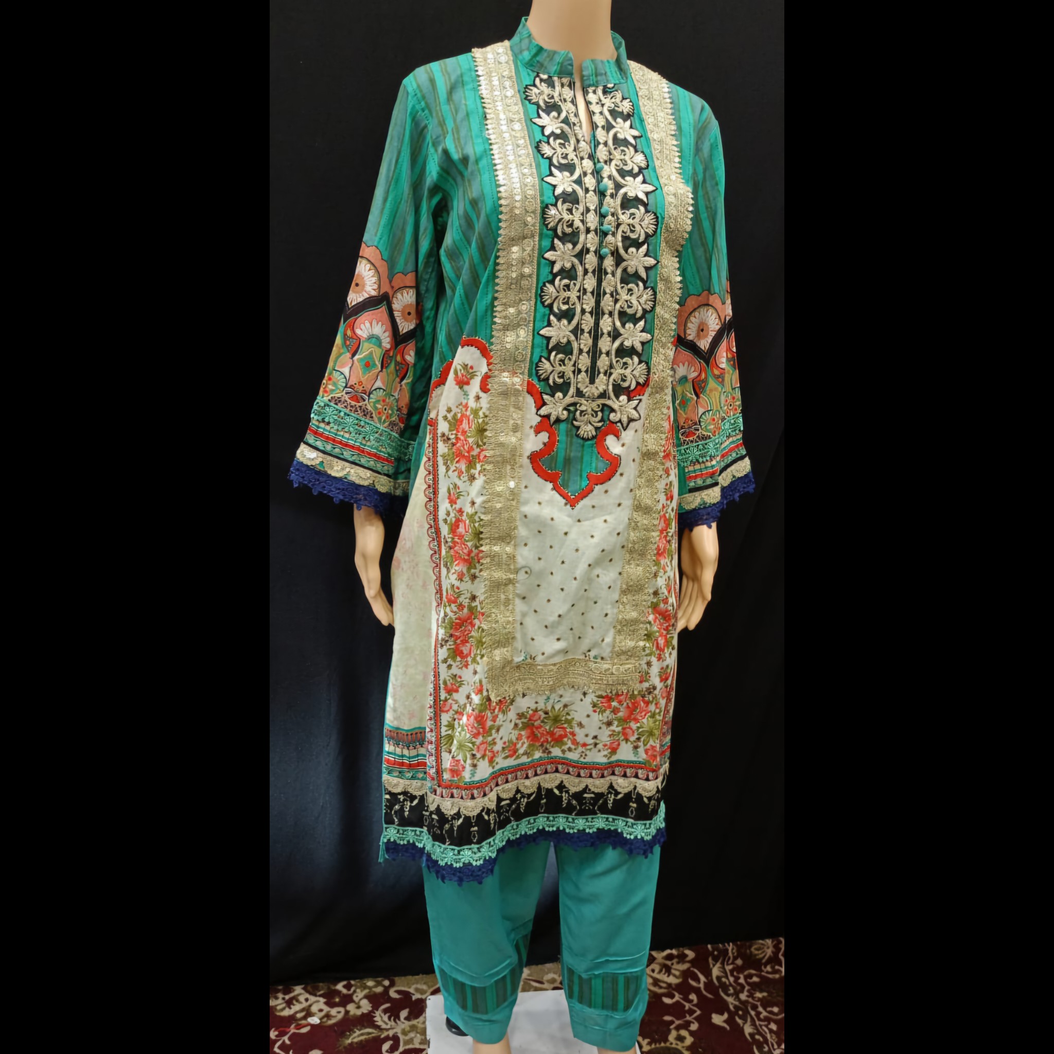 Be the first to review “Jade Green Multicolored Embroidered Cotton Suit 46” Cancel reply