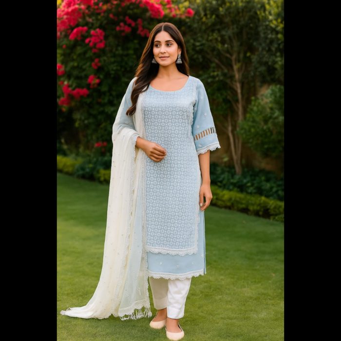 - Kurti: The light blue kurti is adorned with intricate white threadwork, creating a beautiful contrast that exudes elegance. The detailed embroidery along the front and hem adds a touch of sophistication.