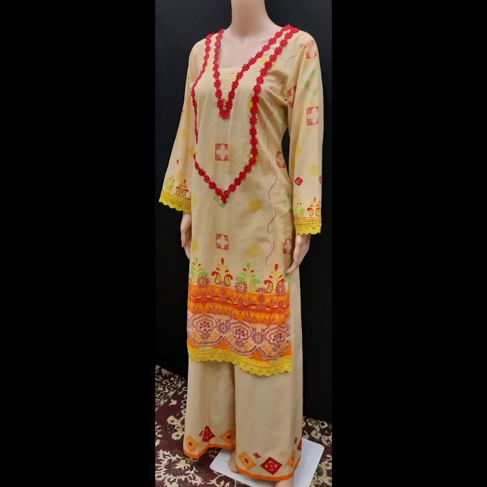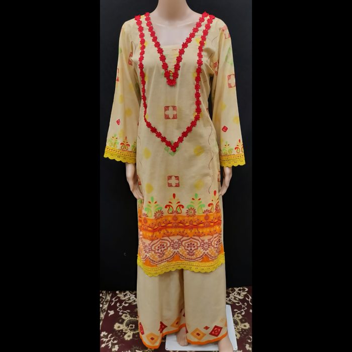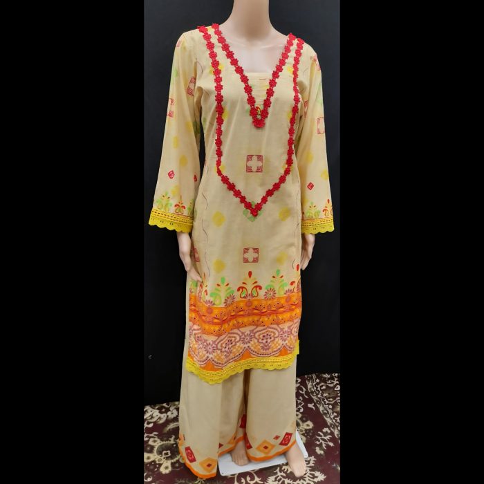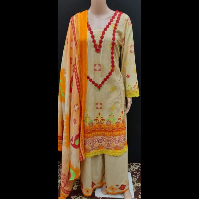 Elevate your style with this exquisitely designed Pakistani-style ready-to-wear suit, tailored to perfection for ultimate comfort and elegance. Crafted from premium-quality cotton and lawn fabric, this suit is lightweight, breathable, and ideal for festive occasions or casual outings alike.