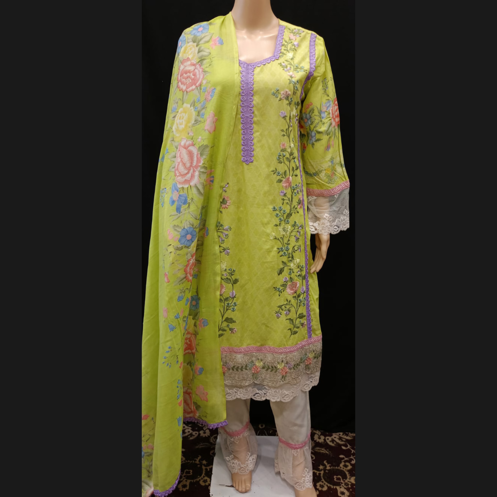 Lime Green Multicolored Embroidered Cotton Suit 42