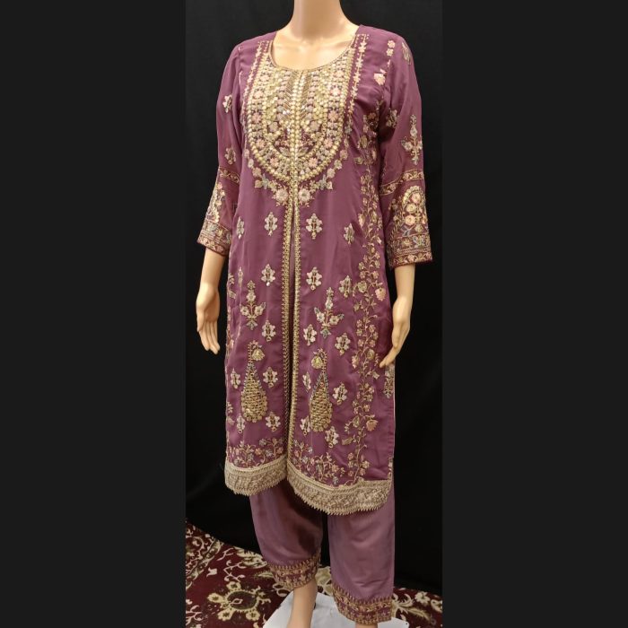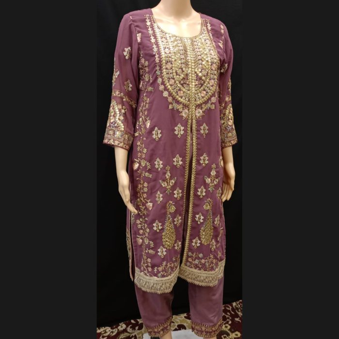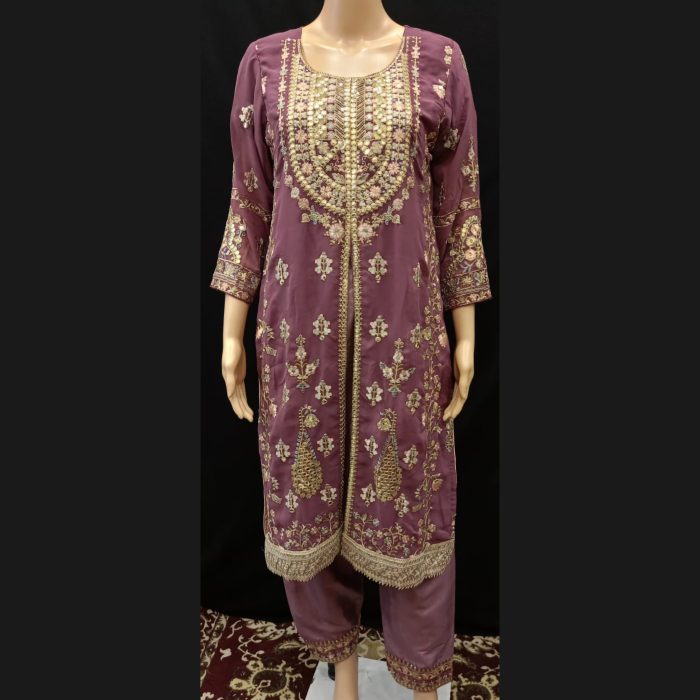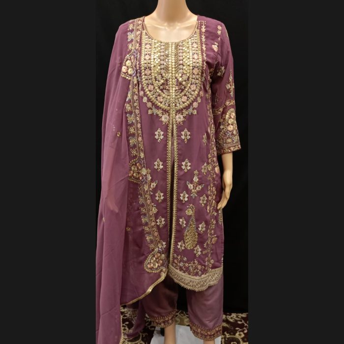 Discover sophistication with our Mauve and Gold Suit, a stunning ensemble crafted for those who appreciate fine details and luxurious design in georgette. The beautiful neckline is delicately fashioned to enhance the suit’s elegant appeal, while intricate gold work covers the fabric, giving it a radiant and refined look that shines with every movement.