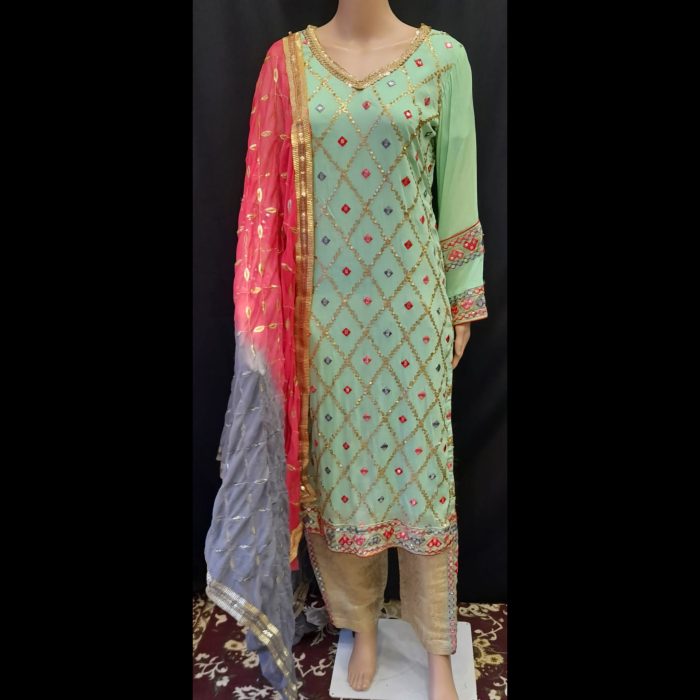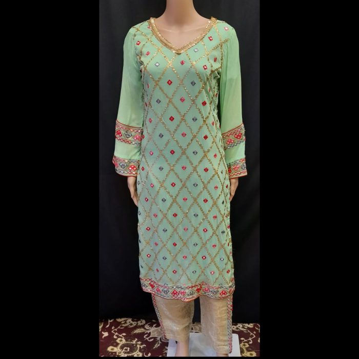 Embrace the beauty of traditional elegance with the Mint Green Embroidered Suit with Jakarta Pants from Glamour & Style. Perfect for festive gatherings, this outfit combines delicate embroidery with luxurious fabric for a sophisticated look.