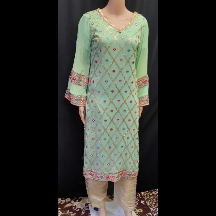 Overview: The Mint Green Embroidered Suit with Jakarta Pants by Glamour & Style is a stunning ensemble that reflects grace and sophistication. Made from premium silk fabric, this outfit is adorned with intricate embroidery that exudes elegance, making it an ideal choice for special occasions.