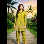 The Olive Green Co-ord Set combines elegance and comfort with a contemporary flair. The set includes a button-down shirt with intricate embroidery on the lower half, paired with matching straight-cut pants. The rich olive color and detailed craftsmanship make this outfit a versatile addition to your wardrobe.