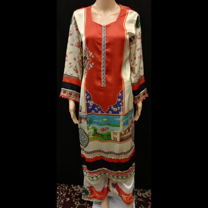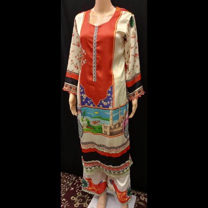 Be the first to review “Cream Multicolored Digital Printed Silk Patchwork Suit 42”