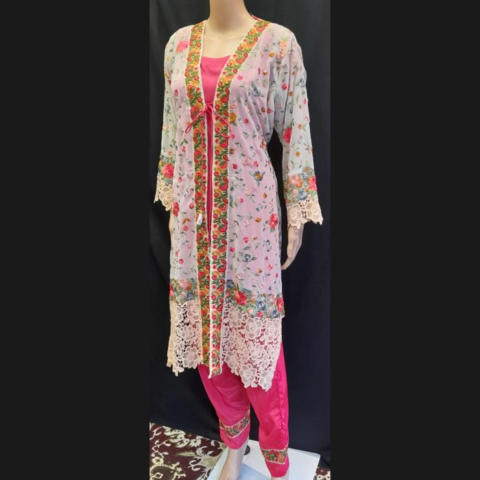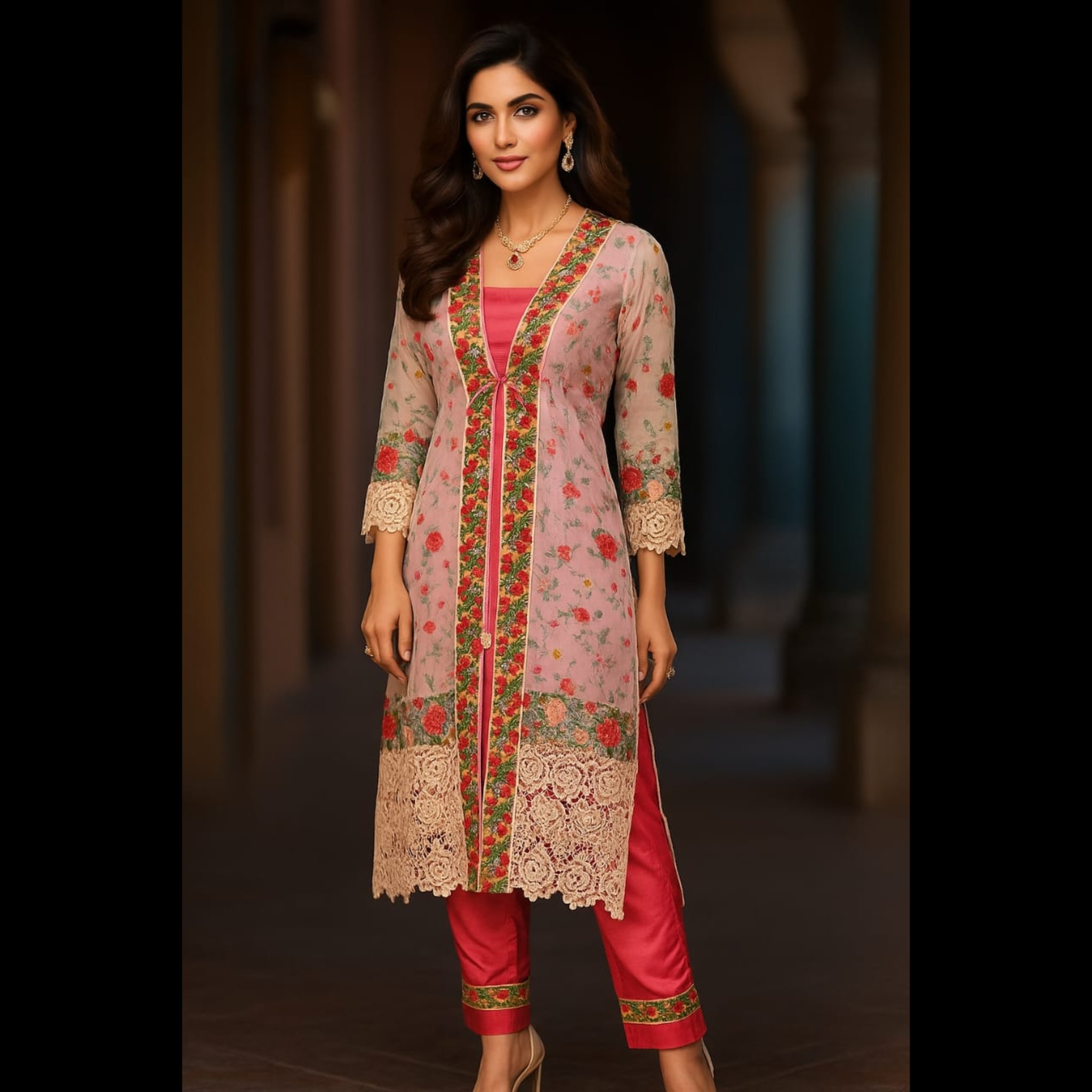 Delicate in its charm, this Petal Pink Suit with Net Jacket offers a beautiful blend of grace and modern style. The airy net jacket enhances the soft pink hue, making this outfit perfect for weddings, parties, or any special occasion. Crafted from high-quality materials, it ensures both comfort and sophistication, allowing you to shine effortlessly.
