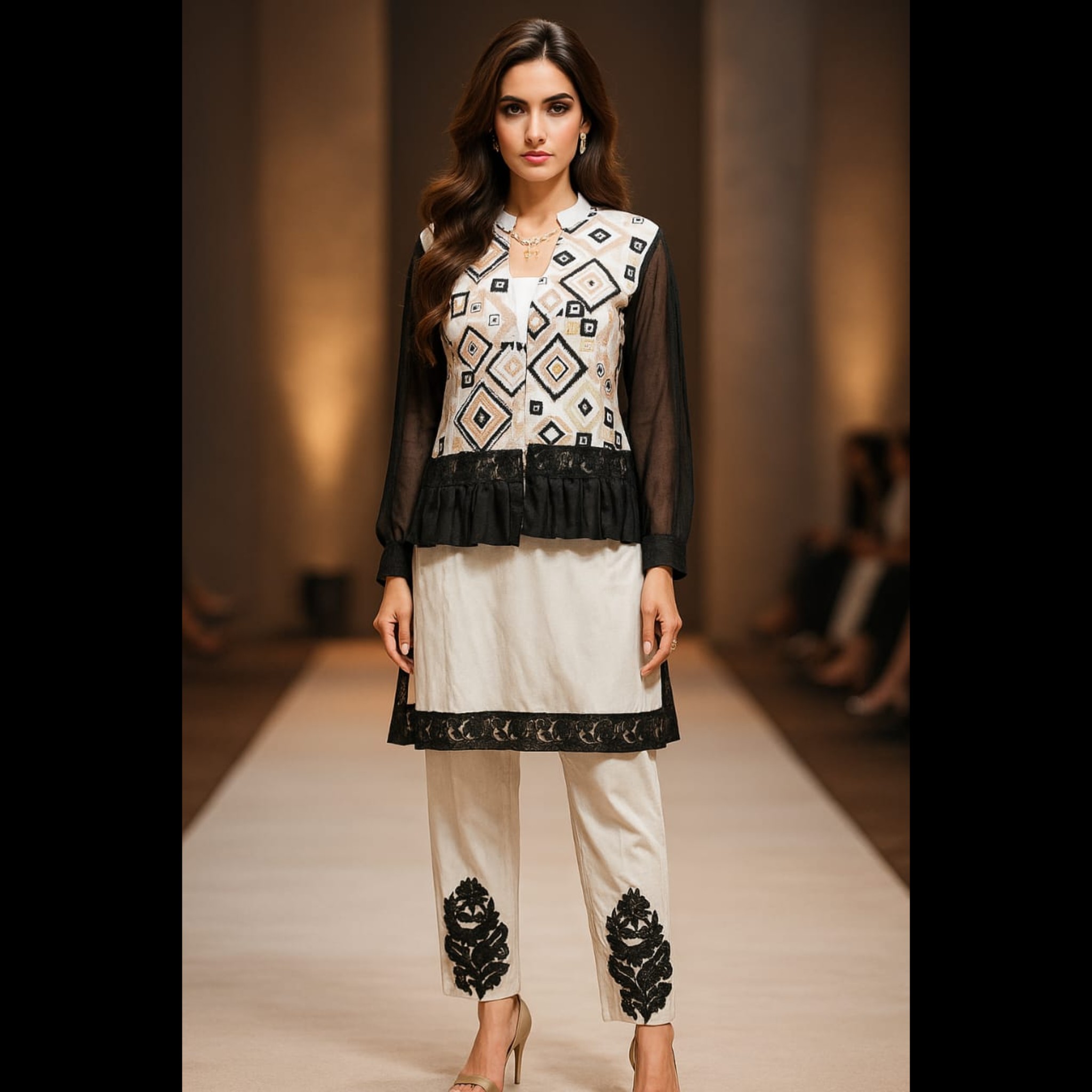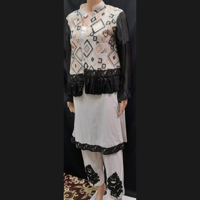 Vibrant and sophisticated, this White & Black Suit with Printed Jacket is the perfect blend of classic and contemporary style. The striking printed jacket adds a unique flair to the timeless black and white ensemble, making it ideal for any occasion. Crafted from premium materials, this outfit ensures comfort while allowing you to express your individuality with confidence.