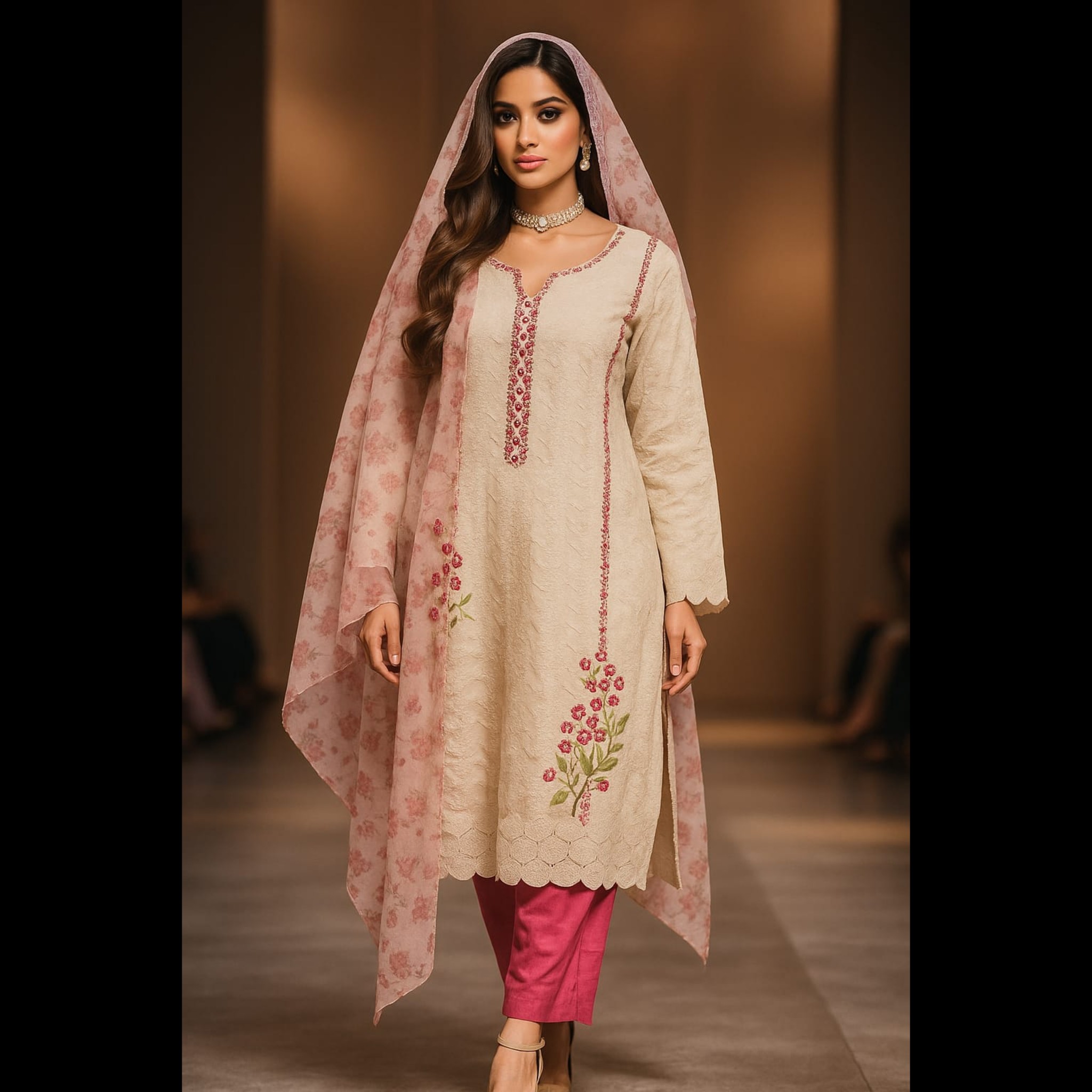 Embroidery: The kurti features intricate aqua-toned embroidery along the neckline, sleeves, and hem. Delicate floral motifs and lace trims enhance its overall aesthetic, creating a look that’s both sophisticated and feminine.