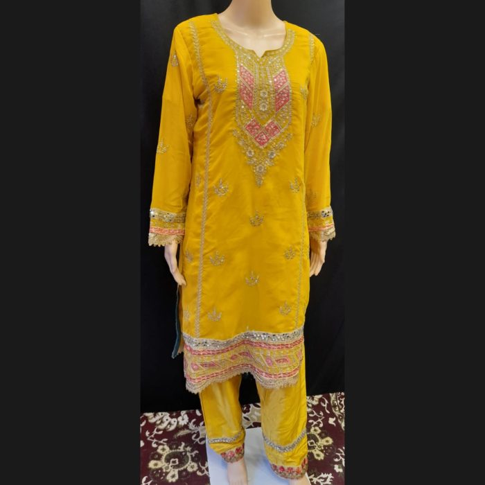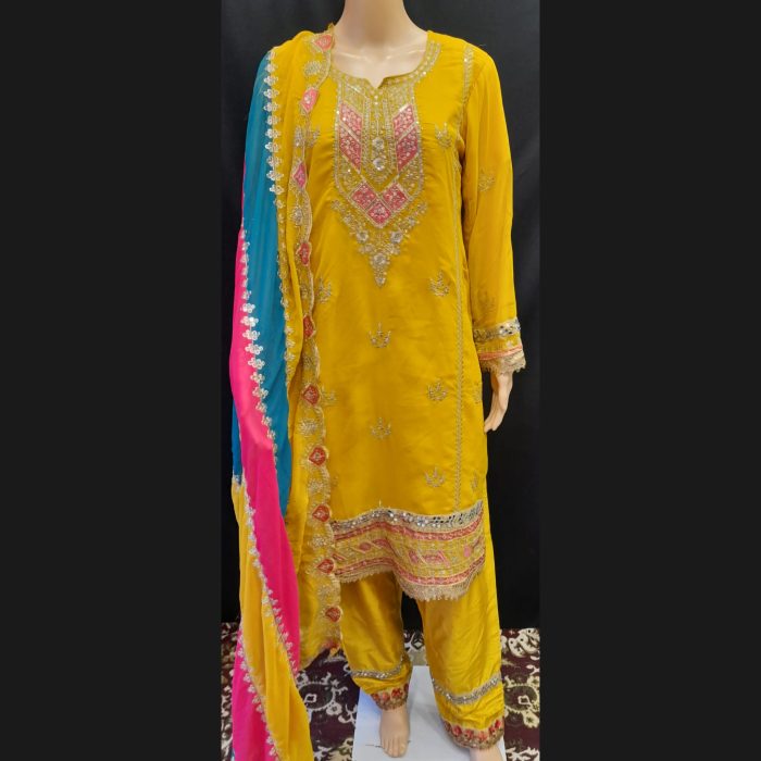 Brighten up any celebration with our radiant Yellow Heavy Embroidered Suit, featuring a stunning multicolored dupatta and crafted from premium georgette fabric. This vibrant yellow suit is meticulously designed with intricate gold, pink, and yellow embroidery that adds a touch of glamour to the elegant silhouette. The embroidery on the top is placed thoughtfully, highlighting the neckline and borders to enhance the traditional charm of the outfit.