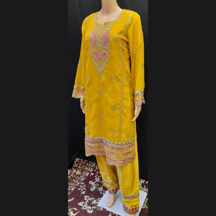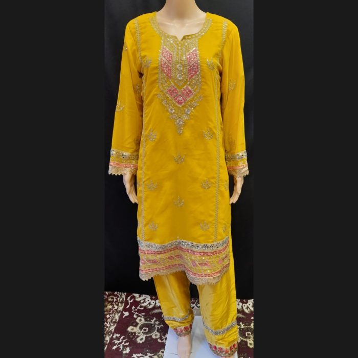 Design: Yellow suit with intricate gold, pink, and yellow embroidery
