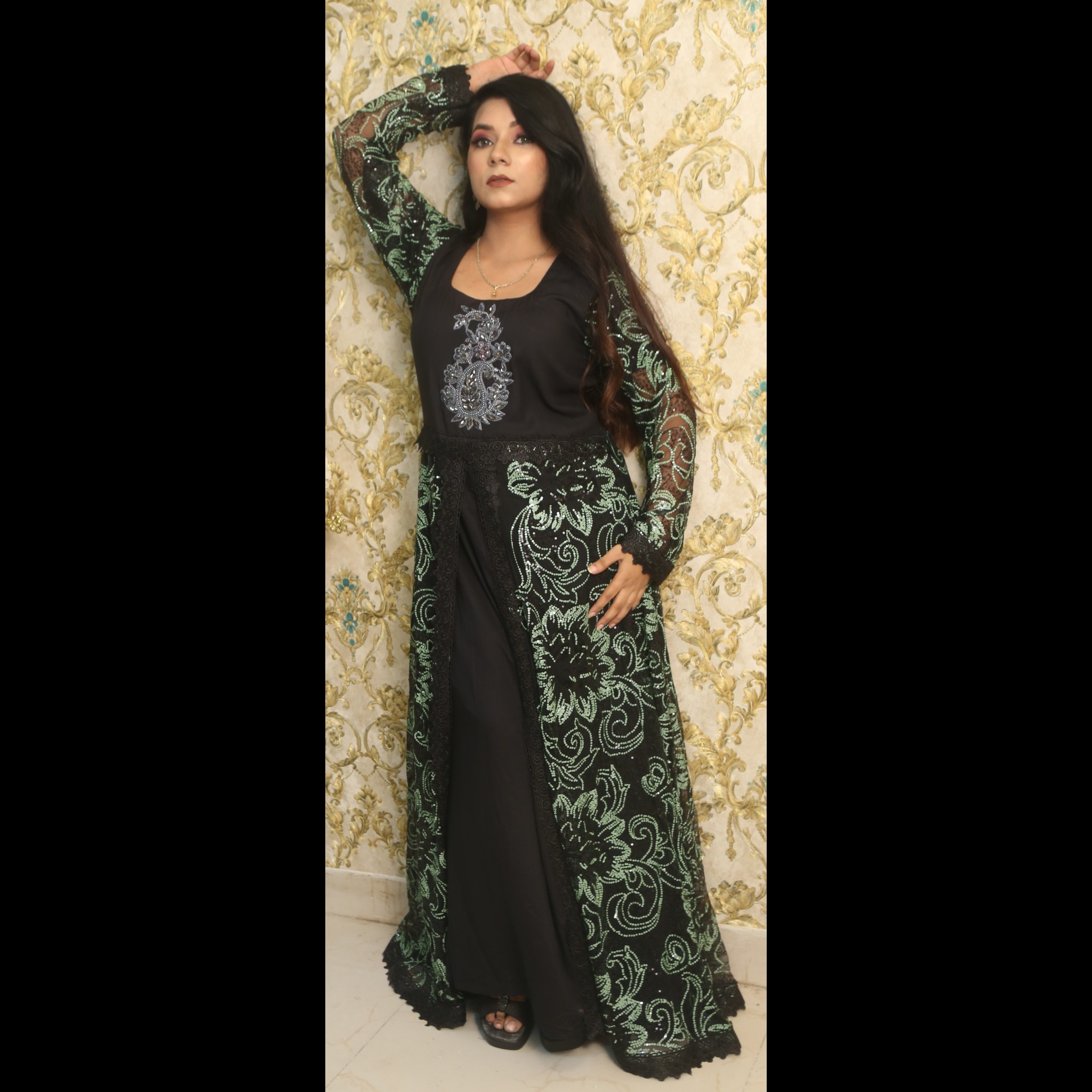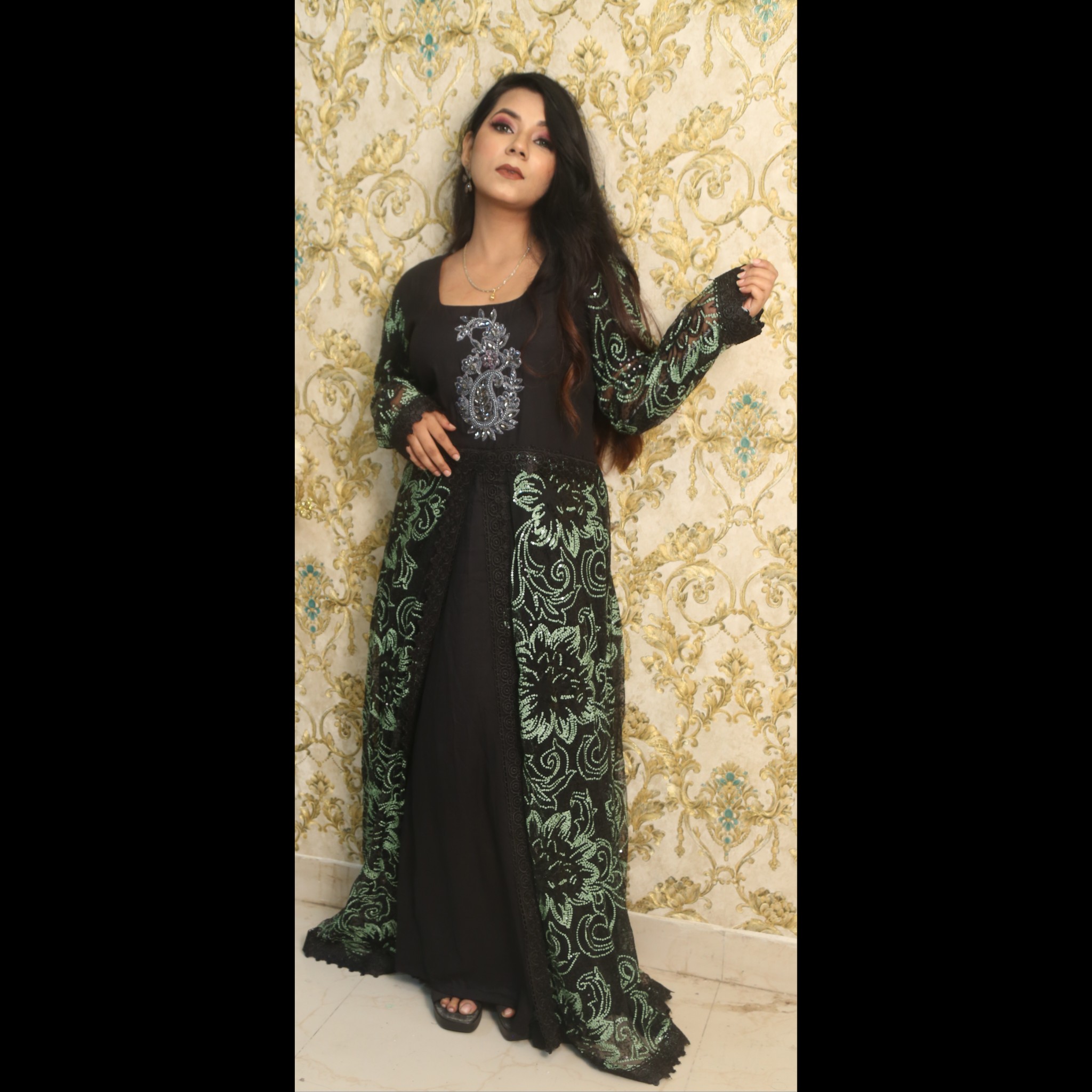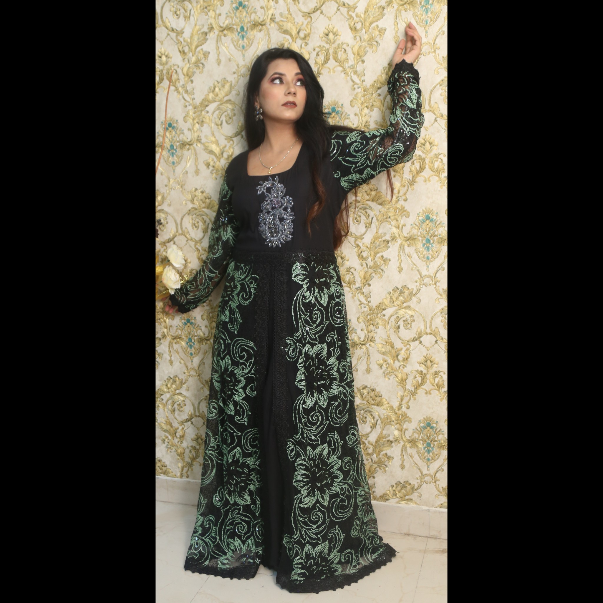 Black Gown With Floral Pattern In Shades Of Green With Pant And Dupatta 40