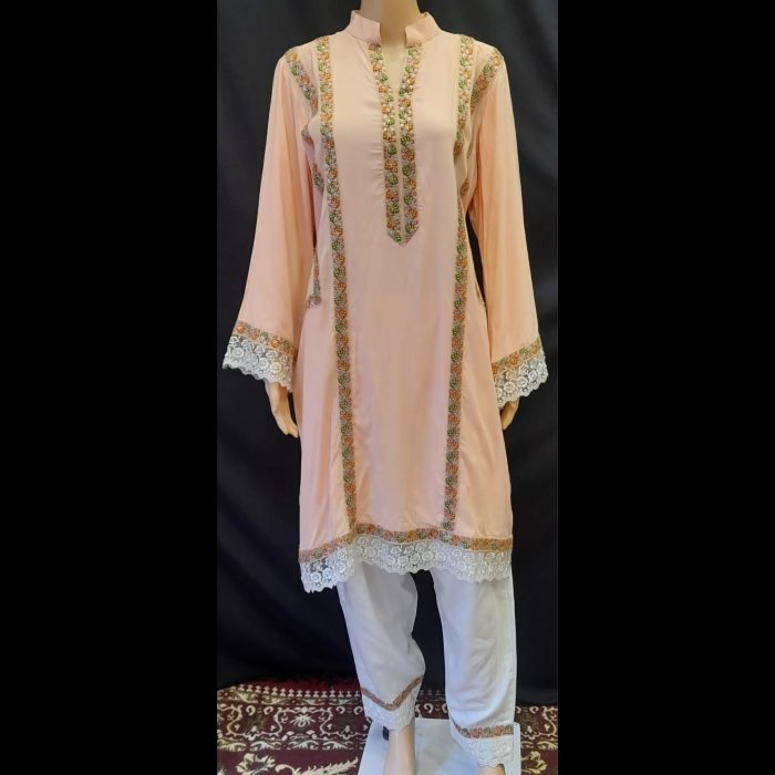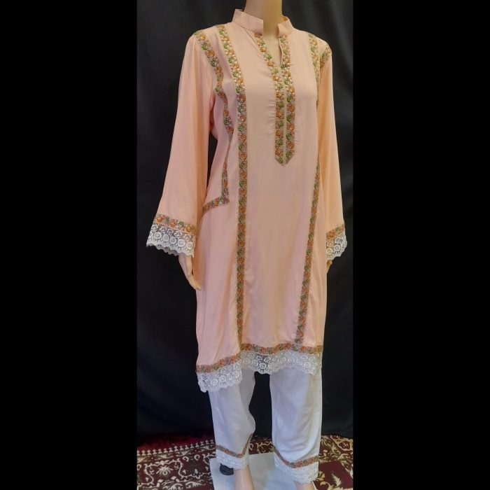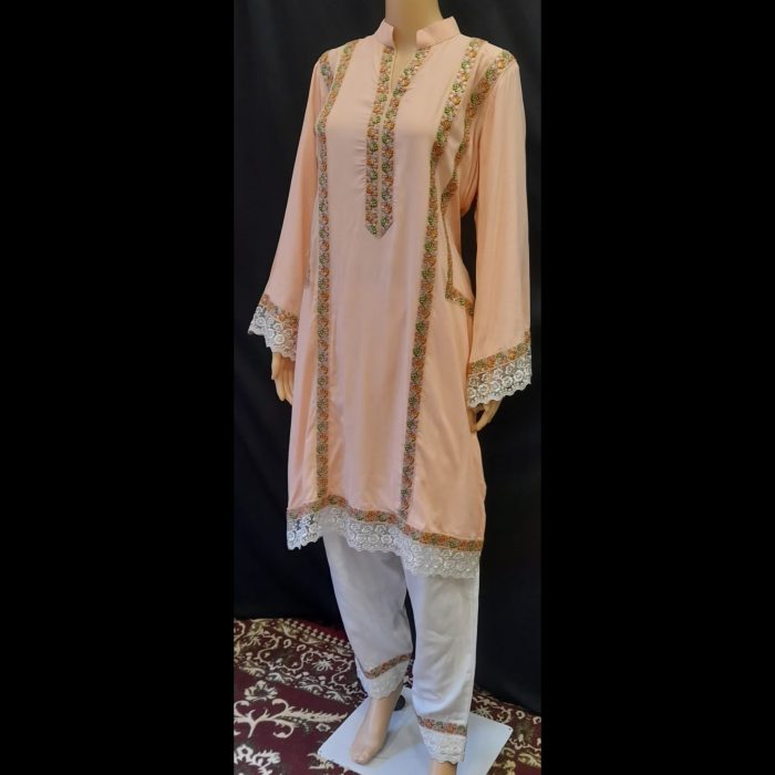 Be the first to review “Light Coral Peach Embroidered Lace Designer Suit 48” Cancel reply