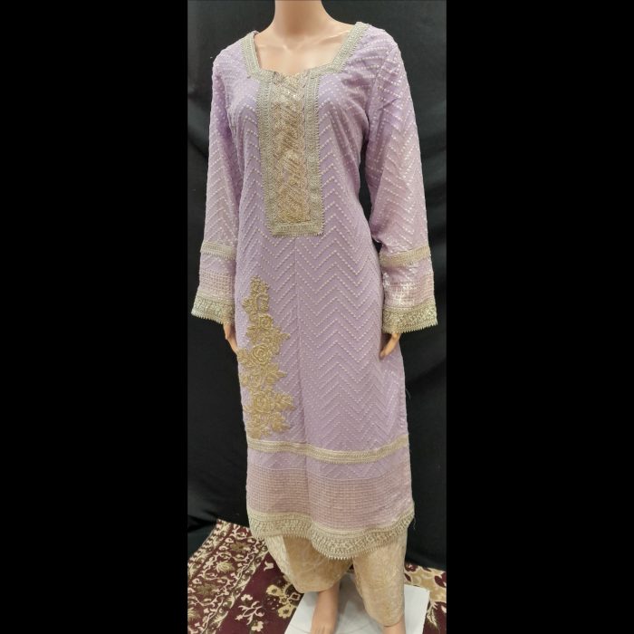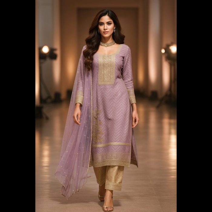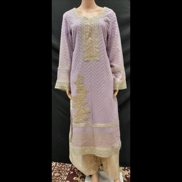Be the first to review “Lilac And Gold Embroidered Suit With Jacquard Pant And Net Dupatta 48” Cancel reply