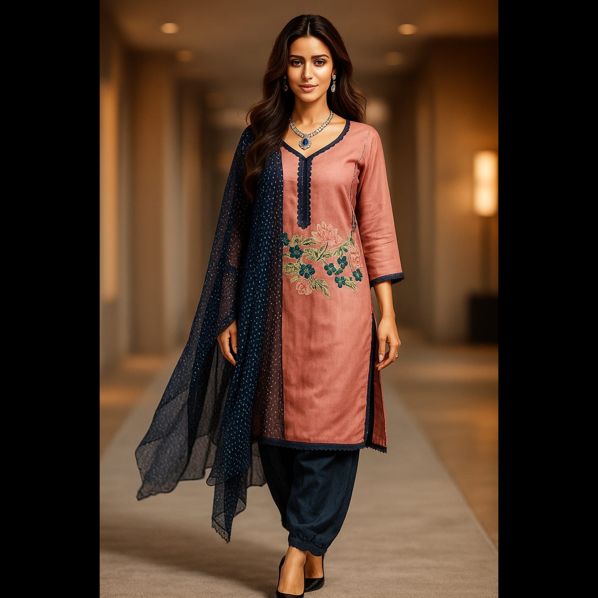 Be the first to review “Salmon Pink Pakistani Style Multicoloured Embroidered Designer Suit 48” Cancel reply