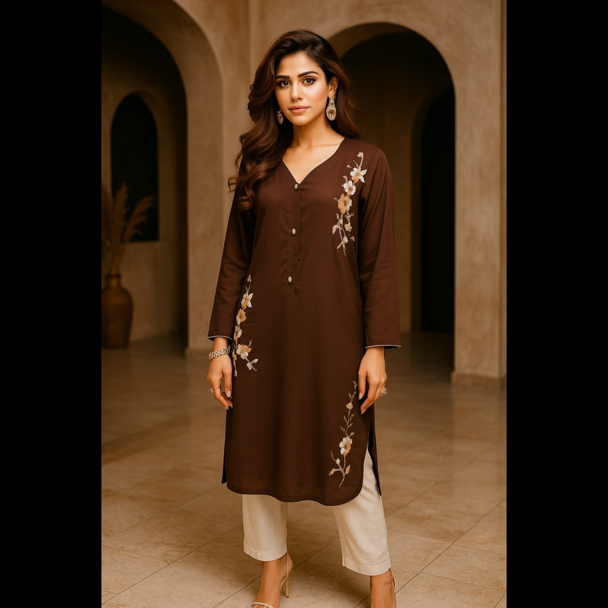 Elevate your style with the Hand Embroidered Co-ord Set, a flawless blend of elegance and contemporary charm. This stunning set features a rich chocolate brownhue that exudes femininity and grace. Intricately embroidered detailing adorns the fabric, adding a touch of artistry and sophistication to the ensemble. Designed for both comfort and style, the co-ord set offers a modern silhouette that’s perfect for any occasion, from casual outings to festive gatherings. The luxurious fabric drapes beautifully, making this outfit a must-have for those looking to make a statement while staying effortlessly chic.