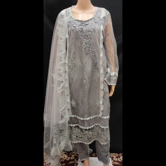 Graceful Grey Embroidered Net Suit 46