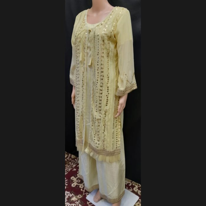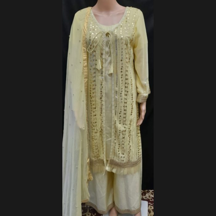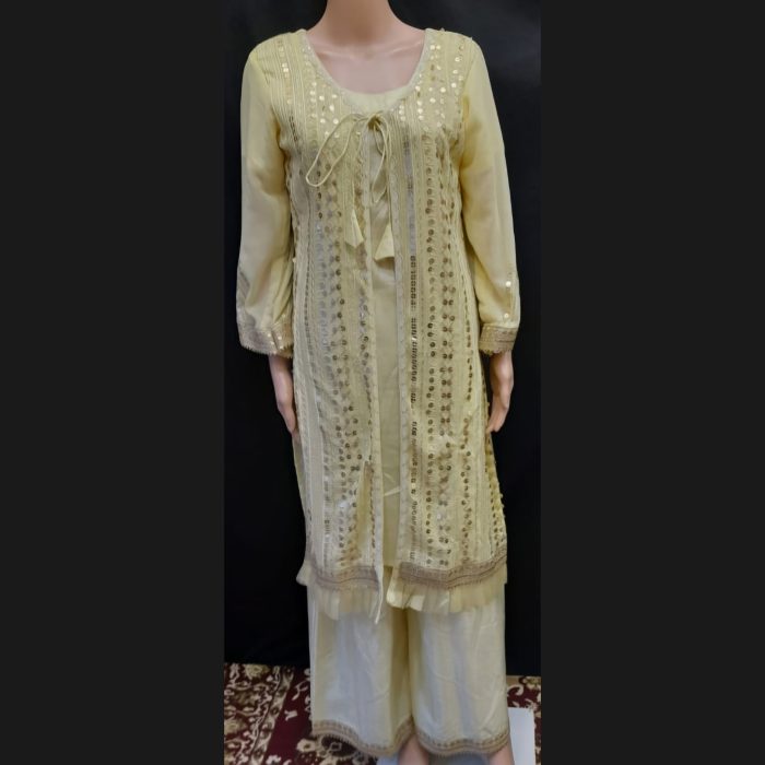 Introducing our Light Yellow Georgette Jacket-Style Suit, an elegant blend of traditional charm and contemporary style crafted to elevate your festive wardrobe. This enchanting ensemble features a light yellow Georgette jacket adorned with intricate sequin work throughout, giving it a radiant sparkle under any light. The jacket’s front is enhanced by delicate dori tassels, adding a graceful touch to the open front design.