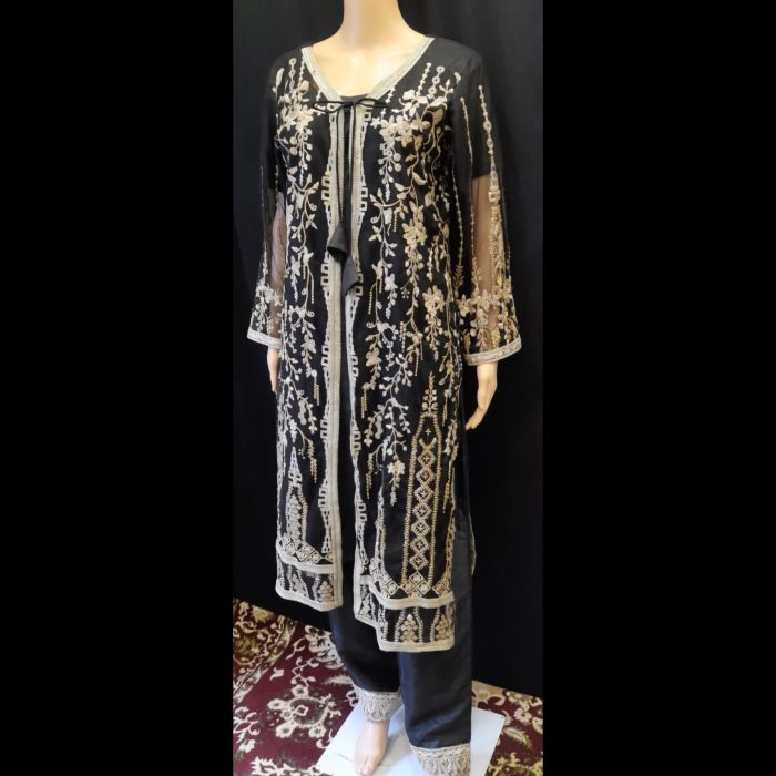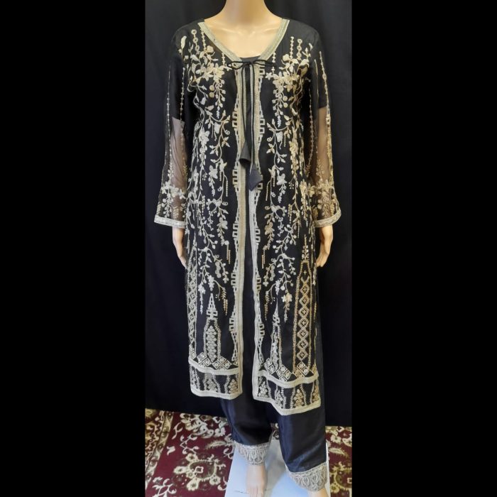 Overview: Introducing the Midnight Black Embroidered Net Ensemble from Glamour & Style. This stunning jacket style outfit is a perfect blend of traditional elegance and modern sophistication, ideal for any special occasion.