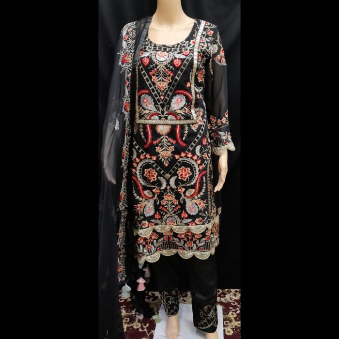 Unveil your elegance with the Regal Black Embroidered Chiffon Suit from Glamour & Style. Featuring rich red and gold embroidery on a deep black base, this ensemble is perfect for festive occasions and evening events.
