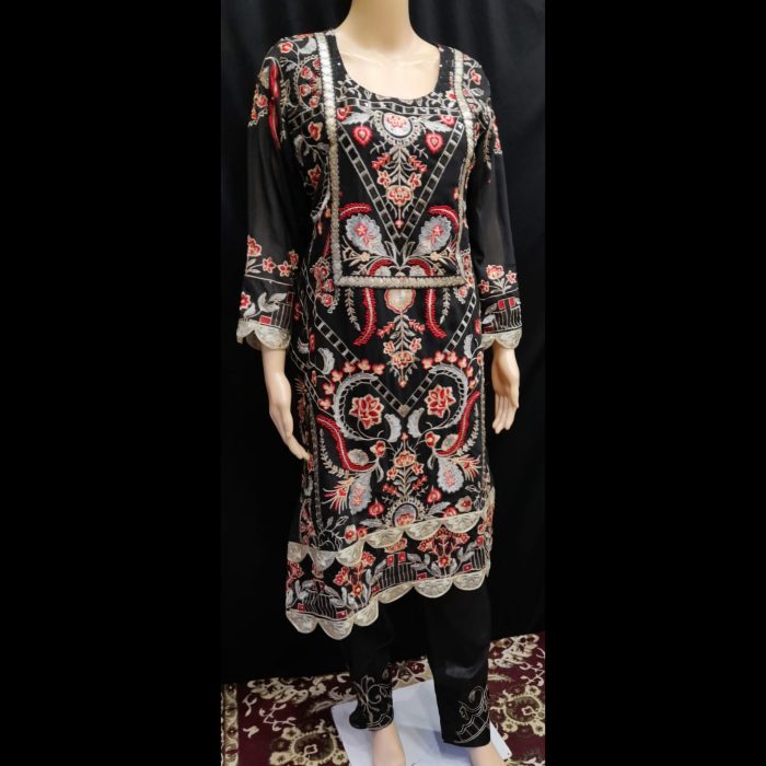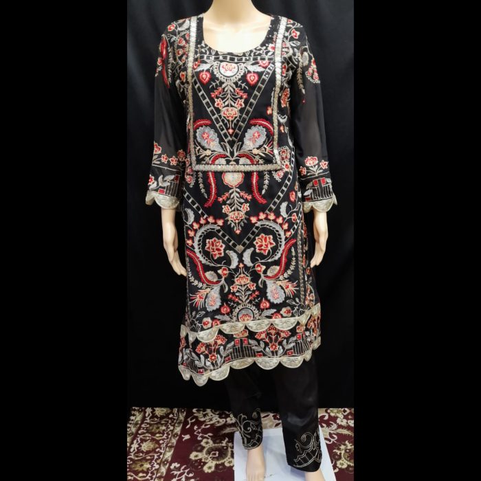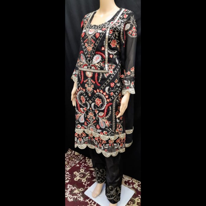 • Trousers: Includes matching black trousers with embroidered hems, completing the look with an elegant finish.
