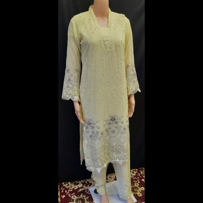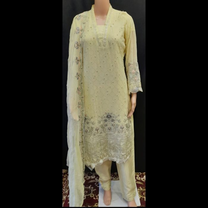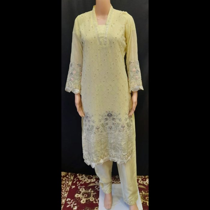 Embrace the subtle elegance of the Soft Yellow Embroidered Chiffon Suit from Glamour & Style. Featuring delicate floral embroidery and a soothing pastel hue, this ensemble is perfect for daytime events and festive celebrations.